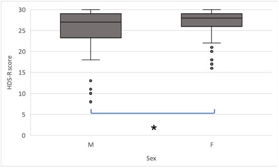 HDS-R scores by sex. Scores were significantly higher in women than in men (* p = 0.037, two-sided Mann–Whitney U test). The center line shows the mean, boxes show the IQR, and whiskers indicate the range. Dots indicate outliers.