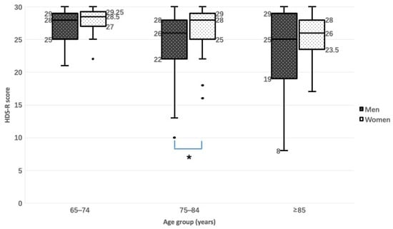 There was a significant difference in HDS-R total score between men and women in the 75–84-year age group according to the two-sided Mann–Whitney U test (Figure 2). HDS-R score decreased with age in men and in women.