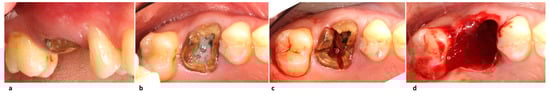 Some authors used Computer-Aided Design (CAD) and Computer-Aided Manufacturing (CAM) technology to fabricate custom healing abutments before or just after the surgery in order to immediately load the fresh socket implant with a substantially lower number of steps for prosthetic finalization [6,7]. Moreover, some additional requests in the immediate implant positioning are a sufficient bone volume, apically and palatally, a fully intact facial bone wall with a thick wall phenotype (≥1 mm), a thick gingival biotype, and an absence of acute infection in the extraction site [8]. On the abovementioned topic, this type of procedure was generally contraindicated when the site was not completely infection-free or showed a generally damaged extraction socket [9,10].