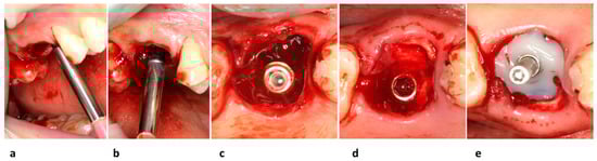 Dental implant placement steps. Implant bed preparation and control of implant direction in the mesial (a), and lateral view (b); occlusal view of placed dental implant (c); view of re-absorbable gelatin sponge around implant within the bone defect (d); screwed PEEK core healing abutment covered with moldable composite resin (e).