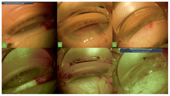 All patients underwent surgery under topical anesthesia. In all the cases studied, stent implantation via MIGS was combined with cataract surgery. Ultrasound phacoemulsification was performed with the Constellation (Alcon Surgical, Ft. Worth, TX, USA) microsurgery system equipped with a 0.9 mm 45-degree Kelman mini-flared TurboSonics tip. A 2.2 mm incision was created in the upper part of the cornea, and forceps were used to perform a capsulorhexis of approximately 5.0 mm in diameter. The in-the-bag phaco chop technique was used for nuclear emulsification. After lens implantation, viscoelastic material was injected to deepen the anterior chamber. After rotation of both the patient’s head and the microscope by approximately 30 degrees, the surgeon used his non-dominant hand to place a goniolens iprism® lens (Glaukos) on the corneal surface for visualization of the angle. Intraoperative gonioscopy was then performed to ensure that there was an appropriate open nasal angle for the implantation of the iStent inject® device. Images of the iridocorneal angle were captured with and without the application of the optimized digital settings, and two stents were then implanted in the trabecular meshwork next to Schlemm’s canal under optimized digital visualization, according to the usual practice of the surgeon.