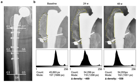 Workflow of the semi-quantitative relative bone density measurement method using ImageJ involving (a) the subdivision into seven periprosthetic Gruen zones (G). (b) Example case of proven bone density loss in zone G1 after prosthesis revision due to periprosthetic fracture. After subdividing the proximal femur into the periprosthetic zones on a conventional AP pelvis standing radiograph, each region was individually tagged with the polygon tool as depicted for G1. ImageJ defined the total number of enclosed pixels (Count) and the measured modal gray values (Mode) together with the corresponding number of pixels as in the displayed histograms. Due to the modal value, external influences, such as the cerclage in this case, had no influence on the result. Then, the modal gray value was normalized with the results of the measurement of the high and low zones of each radiograph. The differences of these scores to the perioperative baseline objectively represented the remodeling of bone density as Δ-density and could thereby prove the decrease of bone density in G1 in the present case.