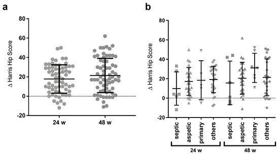The clinical outcome after 24 and 48 weeks with (a) the ΔHHS development of all patients; (b) differences for subgroups. Clinical improvement could be seen for >85% of patients. The greatest improvements were up to 24 weeks and afterward; mainly, little adjustments and a widening of spread took place. Furthermore, a clinical improvement occurred in all subgroups, after 48 weeks the largest for the primary implantation patients, and the smallest for patients after septic loosening. No significant differences were seen between the groups.