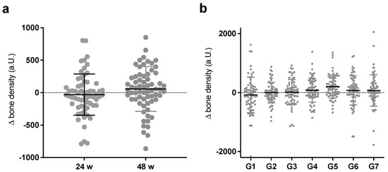 As shown in Figure 3a, no significant difference between the time points was detectable, although a tendency towards an increasing mean was visible. As expected with the open inclusion criteria, there was a wide distribution of scores after 24 weeks, which extended to 48 weeks. Furthermore, again, a major increase took place in the first 24 weeks after surgery, and only minor adjustments followed. A more specific analysis along the periprosthetic Gruen zones showed the widest spread for the proximal zones G1 and G7 and the smallest spread for the distal zone G4 after implantation of the distally fixed MRP-TITAN, but again without significance (Figure 3b). Moreover, there was no clear direction, but both the strongest density increase and decrease were found in G1 and G7 in equal measure.