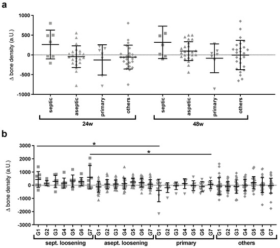 (a): Average Δ-density of subgroups after 24 and 48 weeks; (b) average G1 to G7 of subgroups after 48 weeks. Different quantitative adjustment characteristics emerged for the four subgroups, and the method detected significant differences (* p < 0.05) between the two subgroups septic loosening and primary for both zones G1 and G7. There was, in total, a large increase in bone density after septic causes, in contrast to a small decrease after primary stem implantation, and no consistent trend for the subgroups aseptic loosening and others. Even subdivided into the Gruen zones, there was no uniform adaptation behavior, and the cases were very individual. Nevertheless, it can be observed again that the largest variations were observed in the two proximal zones.