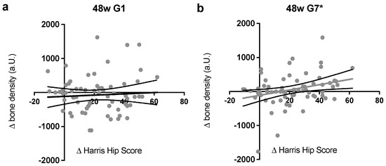 For G7 (Figure 6b), a significant positive correlation (p < 0.05) between the changes of the relative bone density and the Harris hip score after 48 weeks was detected; therefore, a strong relation between the semi-quantitative method and the clinical outcome can be considered.