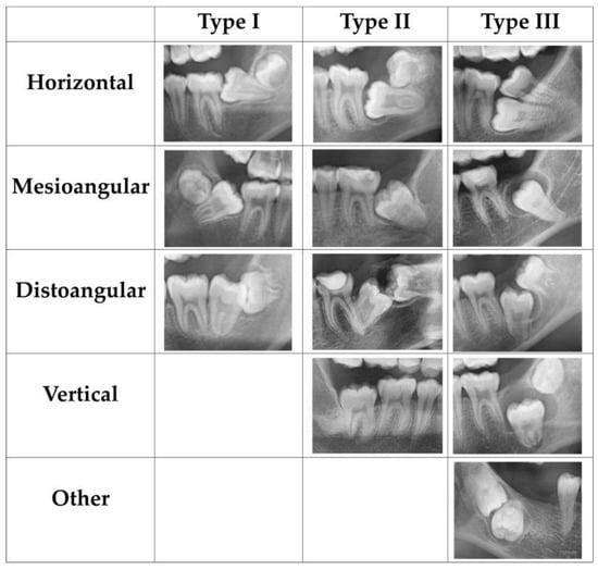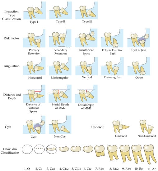 Age was calculated as the date of the first captured MM2 eruption disturbances. Eruption disturbances of MM2 were classified as retention and impaction according to the criteria of Raghoebar et al. [], where retention was classified as primary and secondary; impaction was classified as insufficient space, ectopic eruption path, and cyst according to the pathogenesis. Tooth angulation was categorized as horizontal, mesioangular, vertical, distoangular, or other. The level of MM2 development is classified into 11 stages, according to Haavikko []. We designed a modified classification of the depth level of MM3 impaction from the Pell and Gregory classification, which is more suitable for evaluating MM2 impaction into three classifications.