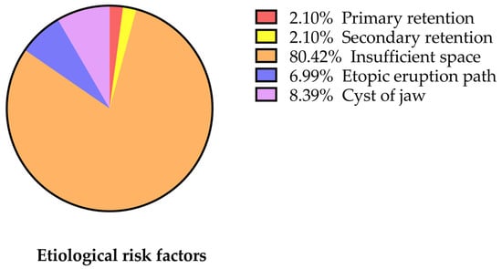 Eruption disturbances of the mandibular molars cause a significant clinical effect because permanent molars are crucial for the development of dentition and coordination of facial growth. Moreover, eruption disturbances can cause a variety of diseases, such as caries in adjacent teeth, pericoronitis, temporomandibular joint symptoms, cysts, and facial infections []. Previous studies have focused on the factors associated with MM3 impaction [,]; however, studies on eruption disturbances of MM2 are limited and are mainly treatment-oriented. Moreover, to the best of our knowledge, few studies have explored the impaction characteristics of MM2. Therefore, the objective of this study was to determine the eruption disturbances characteristics of MM2 and to identify potential etiological factors associated with MM2 eruption failure.