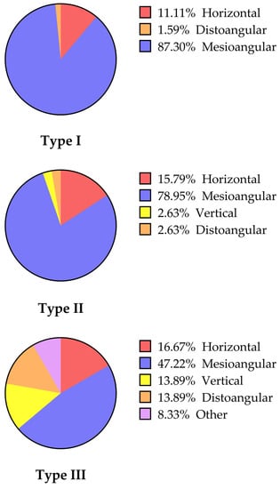 In all three impaction types, mesioangular impaction was the most prevalent angulation pattern, followed by horizontal and distoangular impactions. Notably, vertical and other angulations (fully buccal and lingual inclination that cannot be distinguished on panoramic radiographs) were only observed in Type III impactions, indicating that more directional impaction emerged in deeper impaction. Failure of MM2 eruption toward the occlusal plane may be due to the ectopic development of the tooth germ in other angulations, which causes it to be stuck in the alveolar bone.