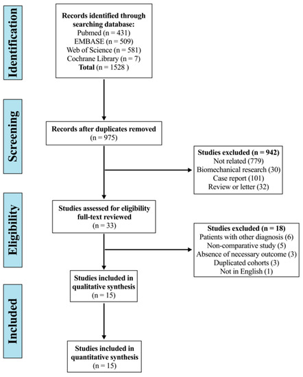 The systematic search yielded 1528 articles, of which 553 were duplicates, and 942 were excluded by screening the title and abstract. After a full-text review, 18 studies were considered improper: six for including patients with diagnosis of trauma, infection, or tumour [13,14,24,25,26,27]; five for non-comparative study (cervical group vs. thoracic group) [9,28,29,30,31]; three for the absence of necessary outcomes [12,32,33]; three for partly duplicated cohorts [11,34,35]; and one for non-English study [36]. Finally, 15 studies were included in this systematic review and meta-analysis (Figure 1) [37,38,39,40,41,42,43,44,45,46,47,48,49,50,51].