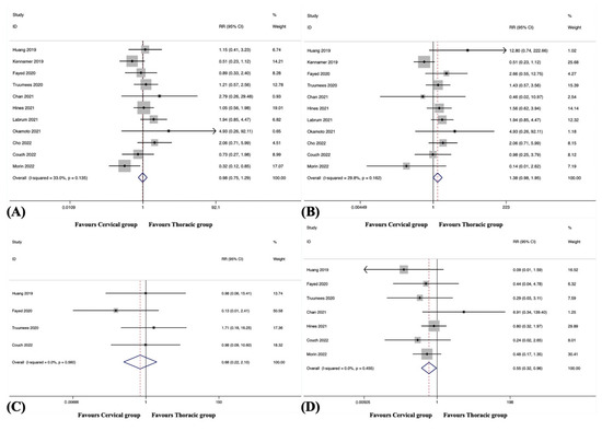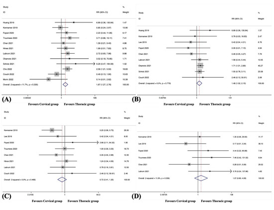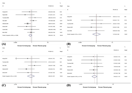 The reoperation rate following surgical complications was observed in four studies, including 449 patients in the cervical group and 297 patients in the thoracic group [38,42,48,51]. The pooled results revealed no significant difference in the reoperation rate following surgical complications between the groups (RR, 0.68; 95% CI 0.22 to 2.10, p = 0.499), with no substantial heterogeneity among studies (I2 = 0.0%, p = 0.560) (Figure 5C).