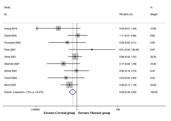 Wound-related complications were observed in nine studies, including 831 patients in the cervical group and 692 patients in the thoracic group [38,41,42,43,45,46,48,49,51]. The pooled results revealed a significantly lower incidence of wound-related complications in the cervical group than in the thoracic group (RR, 0.58; 95% CI 0.36 to 0.92, p = 0.022), with no significant heterogeneity among studies (I2 = 7.3%, p = 0.374) (Figure 4).