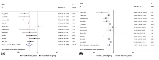 ORT was reported in 10 studies, including 611 patients in the cervical group and 570 patients in the thoracic group [38,41,42,44,45,46,47,48,49,50]. Significant heterogeneity was detected (I2 = 75.3%, p < 0.001). The pooled results revealed a significantly reduced ORT in the cervical group compared to the thoracic group (WMD, −43.47; 95% CI −59.42 to −27.52, p < 0.001) (Figure 6A).