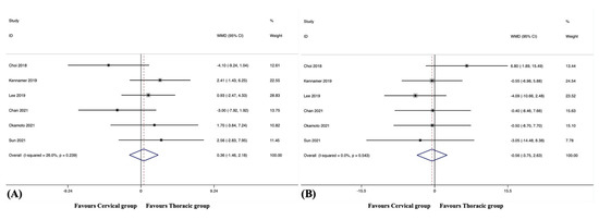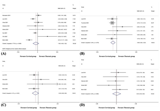 The NDI score at the final follow-up was reported in eight studies, including 413 patients in the cervical group and 278 patients in the thoracic group [39,40,41,45,46,47,49,50]. Significant heterogeneity was detected (I2 = 77.5%, p < 0.001). The pooled results revealed no significant difference in the NDI score at the final follow-up between the groups (WMD, −1.63; 95% CI −4.50 to 1.23, p = 0.264) (Figure 7A).