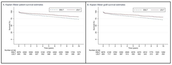 The patient survival rates for LDLT in this study at 1, 3, 5, and 10 years (95.2%, 92.6%, 90.1%, and 81.9%, respectively; p < 0.001) were significantly better than those for DDLT recipients (93.2%, 87.6%, 83.3%, and 72.7%, respectively; p < 0.001) (Figure 1). Similarly, there was a graft survival benefit at 1, 3, 5, and 10 years for LDLT (94.1%, 91.1%, 88.5%, and 80.5%, respectively; p < 0.001) compared to DDLT recipients (92.1%, 86.5%, 82.1%, and 70.9%, respectively; p < 0.001).