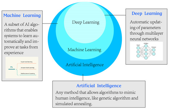 The differences and relationships among artificial intelligence (AI), machine learning (ML), and deep learning (DL).