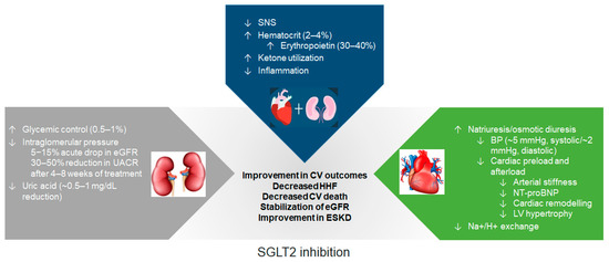 - Fontes-Carvalho, R.; Santos-Ferreira, D.; Raz, I.; Marx, N.; Ruschitzka, F.; Cosentino, F. Protective Effects of SGLT-2 Inhibitors Across the Cardiorenal Continuum: Two Faces of the Same Coin. Eur. J. Prev. Cardiol. 2022, 29, 1352–1360. [Google Scholar] [CrossRef] [PubMed]