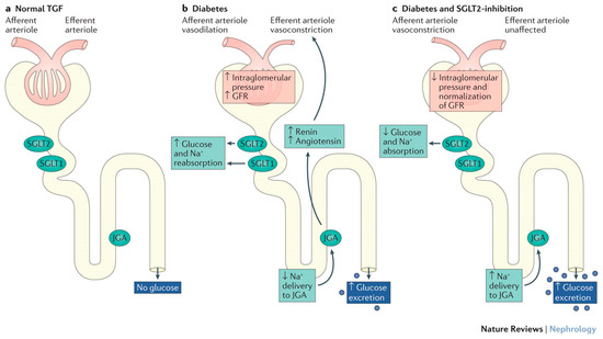 - van Bommel, E.J.M.; Muskiet, M.H.A.; van Baar, M.J.B.; Tonneijck, L.; Smits, M.M.; Emanuel, A.L.; Bozovic, A.; Danser, A.H.J.; Geurts, F.; Hoorn, E.J.; et al. The Renal Hemodynamic Effects of the SGLT2 Inhibitor Dapagliflozin Are Caused by Post-Glomerular Vasodilatation Rather than pre-Glomerular Vasoconstriction in Metformin-Treated Patients with Type 2 Diabetes in the Randomized, Double-Blind RED Trial. Kidney Int. 2020, 97, 202–212. [Google Scholar] [CrossRef]