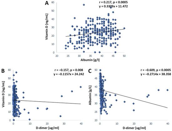 4.3. Interrelation of Serum Levels of Vitamin D, Albumin, and D-Dimer in Patients with COVID-19