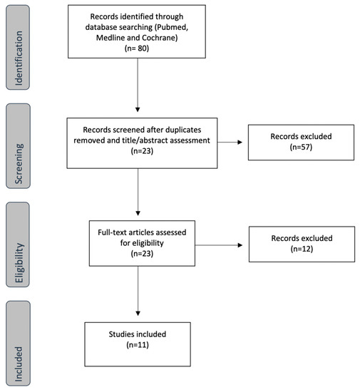 In the first search applying the inclusion criteria, 80 articles were identified. After eliminating duplicates and reading the title and abstract, 23 articles were selected for full-text evaluation. Ultimately, 11 studies were included for analysis. Figure 1 shows the literature screening process.