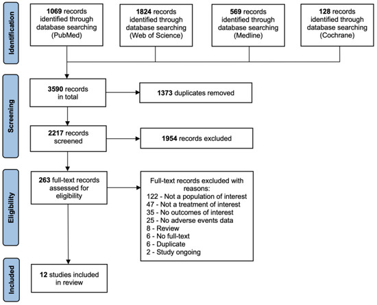 The systematic search resulted in 3590 records in total from 4 sources. After 1373 duplicates were identified using Mendeley Desktop (version 1.19.8) and removed manually, 2217 records were roughly screened using title and abstract for clinal trials meeting the inclusion criteria. Out of these, 263 full-text records were assessed for eligibility, and 12 studies were included in the following systematic review. The process of literature search and study selection until the final decision on included studies was presented in the PRISMA flow chart in Figure 1.
