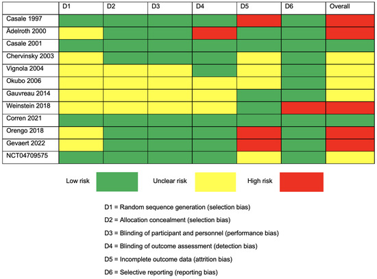 Traffic light plot for Cochrane Collaboration’s proposal for the assessment of the risk of bias (RoB 2) for RCTs [19,20,21,22,23,24,25,26,27,28,29,30].