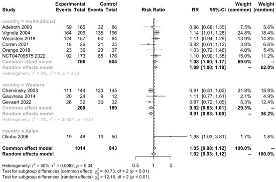 Ten RCTs (n = 1857) informed the total subjects experiencing adverse events, and the test for heterogeneity indicated a medium heterogeneity (I2 = 49.7%, p = 0.0365). Subgroup analysis was conducted to detect the source of heterogeneity, and we found that country played a significant role (I2 = 0%, p = 0.5, Figure 3), but subgrouping based on type of AR, age group of patients, and type of mAb didn’t reduce heterogeneity (Figures S1–S3). However, neither the subgroup analysis nor the overall random effects model (RR 1.02, 95% CI 0.93–1.12, Figure 3) showed significant differences in experiencing adverse reactions between the mAb-treatment and placebo group. There was no strong evidence of publication bias.
