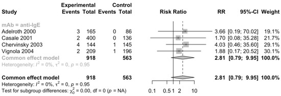 Regarding common adverse events, the risk of experiencing headache (RR 0.88, 95% CI 0.73–1.06, Figure S4), upper respiratory infection (RR 1.05, 95% CI 0.76–1.47, Figure S5), viral infection (RR 0.9, 95% CI 0.59–1.36, Figure S6), pharyngitis (RR 1.12, 95% CI 0.69–1.81, Figure S7), nasopharyngitis (RR 0.92, 95% CI 0.72–1.17, Figure S8), injection site reactions (RR 1.21, 95% CI 0.85–1.73, Figure S9), and urticaria (RR 2.81, 95% CI 0.79–9.95, Figure 4) were not significantly different between patients treated with monoclonal antibodies and placebo. Among them, pharyngitis and urticaria occurred only in omalizumab trials, and it was reasonable to speculate that patients treated with omalizumab might have an increased risk to experience urticaria though it failed to reach statistically significant. There was no strong evidence of heterogeneity.