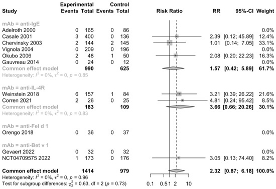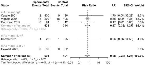 Forest plot of RCTs comparing rates of patients with urticaria subgrouped by type of mAb [20,21,22,23].