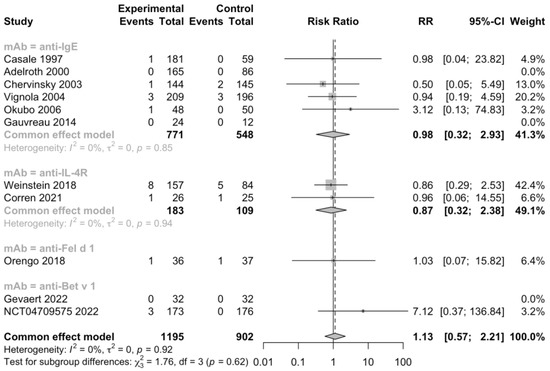 The following supporting information can be downloaded at: https://www.mdpi.com/article/10.3390/jcm12082848/s1, Figure S1: Forest plot of RCTs comparing patients experiencing adverse events subgrouped by AR type [20,22,23,24,25,26,27,28,29,30]; Figure S2. Forest plot of RCTs comparing patients experiencing adverse events subgrouped by age group [20,22,23,24,25,26,27,28,29,30]; Figure S3. Forest plot of RCTs comparing patients experiencing adverse events subgrouped by type of mAb [20,22,23,24,25,26,27,28,29,30]; Figure S4. Forest plot of RCTs comparing rates of patients with headache subgrouped by type of mAb [19,21,22,23,24,27,28,29,30]; Figure S5. Forest plot of RCTs comparing rates of patients with upper respiratory infection subgrouped by type of mAb [21,22,23,25,27,28]; Figure S6. Forest plot of RCTs comparing rates of patients with viral infection subgrouped by type of mAb [21,22,23,27,28]; Figure S7. Forest plot of RCTs comparing rates of patients with pharyngitis subgrouped by type of mAb [19,21,23]; Figure S8. Forest plot of RCTs comparing rates of patients with nasopharyngitis subgrouped by type of mAb [22,23,27,28,29,30]; Figure S9. Forest plot of RCTs comparing rates of patients with injection site reactions subgrouped by type of mAb [20,22,23,26,27,28,29].