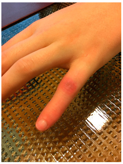 The ETDNO study described a skin complication secondary to the orthosis use. This complication occurred when patients with a flexion contracture measuring greater than 30° received a straight tube ETDNO. This manifested in skin redness and sores on the dorsal aspect of the PIP joint. This pathology was a clear sign of the limit of skin tolerance to pressure [19] (Figure 1).