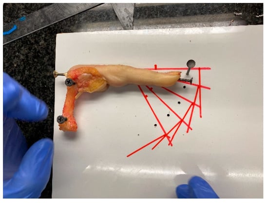 To investigate the third hypothesis of the study, researchers constructed 50 ETDNOs. The ETDNOs consisted of five groups of ten ETDNOs. Each group had a different tube angle. The first group had ETDNO tubes hyperextended at 15°, the second group featured a straight tube, the third group had ETDNO tubes at 15° of flexion, the fourth group of ETDNO tubes had 30° flexion and, finally, the last group had ETDNO tubes at 45° (Figure 5). Only one therapist performed and recorded all measurements of the forces that the orthoses generated to obtain the mean force. We calculated the mean force of the ETDNO at +15°, 0°, 15°, 30° and 45°. We then compared all force-related computations to determine which ones were below the recommended level.