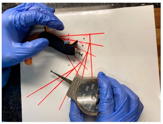 Researchers drew guide-lines on the wooden support to ensure that when applying the dynamometer, they applied force without varying the lever arm from the joint axis. This approach ensured that the force vector was always at 90° (Figure 3). To avoid measurement errors, three people performed and recorded all measurements three times to obtain the mean. This resulted in a total of nine measurements.