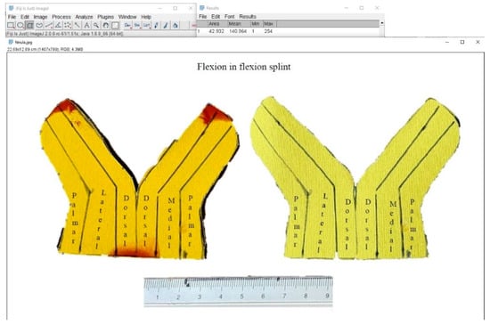 We did not designate the contact areas of the LMB 501 because the finger volar and dorsal aspect contact areas were clear. After placement of the ETDNO orthoses on the concrete model, the researcher applied colored spray around the orthosis to clearly mark all the empty spaces between the orthosis and the finger (Figure 8). When the spray dried, the researchers removed the orthosis and examined the surfaces of the orthosis. Using the Fiji software (Figure 9), they measured the area of the original color that remained.