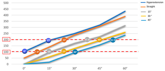 Therapeutic range of the ETDNO constructed at different angles. The values that are within the red range are the tolerable ranges for the patients in terms of pain.