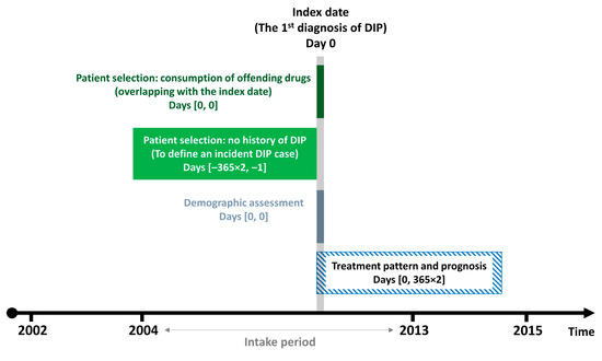 We identified individuals diagnosed with DIP (International Classification of Diseases, Tenth Revision (ICD-10) codes G21.1 (other drug-induced secondary parkinsonism) or G25.1 (drug-induced tremor)) as the primary or secondary diagnosis between 1 January 2004 and 31 December 2013 (Figure 1). The earliest date of DIP diagnosis was defined as the index date. At least one outpatient prescription for the offending drug was required to be for a time period that overlapped the index date. Offending drugs included typical and atypical antipsychotics (amisulpride, aripiprazole, chlorpromazine, clozapine, haloperidol, olanzapine, paliperidone, perphenazine, pimozide, quetiapine, risperidone, sulpiride, and ziprasidone), GI motility drugs (clebopride, domperidone, itopride, levosulpiride, metoclopramide, and mosapride), and flunarizine, which were available in South Korea during the study period. To identify incident DIP cases, patients with DIP diagnoses preceding the index date by up to two years were excluded from the study.