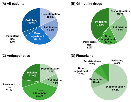 Treatment patterns differed according to the type of drug used. Most patients taking GI motility drugs switched to other GI motility drugs (38.4%) or reinitiated drugs after temporary discontinuation (28.8%). Among the patients who reinitiated drugs, 61.9% initiated other kinds of GI motility drugs, while 38.1% initiated the same drug with or without dose adjustment (11.9% and 26.2%, respectively). Patients taking antipsychotics mostly adjusted the dose of antipsychotics (39.8%) or switched to other antipsychotics (23.0%). The proportion of patients who persistently used offending drugs was higher in antipsychotic users (7.1%) than in GI motility drug users (2.0%). Most patients taking flunarizine discontinued the drug (69.2%).