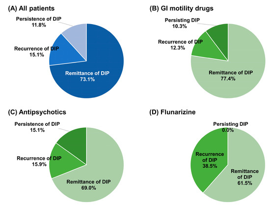 DIP remittance occurred in more than 70% of all patients, from 61.5% of the flunarizine users to 77.4% of the GI motility drug users (Figure 3). However, approximately 25% of the patients had recurrent or persistent DIP. Male patients had a higher proportion of recurrent (17.6% vs. 13.5%) and persistent (13.7% vs. 10.6%) DIP compared to female patients.