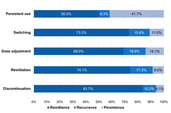 We estimated the proportion of patients with each type of treatment change and prognosis. The proportion was calculated among all patients with incident DIP and for each therapeutic class (i.e., antipsychotics, GI motility drugs, and flunarizine). We estimated the time from the index date to the first treatment change, DIP remittance, and DIP recurrence. The time to event was analyzed in patients who experienced each type of event. For example, we estimated the time to remittance in patients who had previously experienced remittance during the follow-up period. Additionally, the proportion of patients with each type of prognosis was categorized by the type of treatment change to compare the proportion of DIP remittance across the types of treatment change.