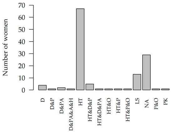 Figure 1. Treatments used among the subjects OX (D = Diet, PA = Physical Activity, P = Physiotherapy, O = Osteopathy, A = Acupuncture, PK = Pain Killer, HT = Hormonal Therapy, LS = Laparoscopy, H = Herbal, NA = Not Applicable, PS = Psychotherapy), OY (number of women undergoing treatment). - There was a relationship between the presence of pain outside the pelvis (in other parts of the body) and the treatment modality for endometriosis, p-value = 0.0311, V = 0.4549 (Table 1, Figure 1). All subjects reported that they clench their teeth; we did not assess anxiety/stress levels in this study.