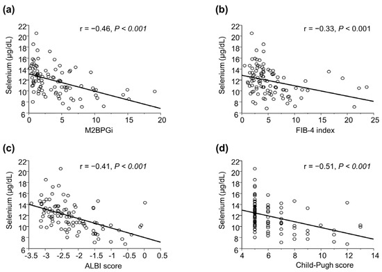 The serum selenium levels were negatively correlated with M2BPGi (r = −0.46, p < 0.001; Figure 1a), FIB-4 index (r = −0.33, p < 0.001; Figure 1b), ALBI score (r = −0.41, p < 0.001; Figure 1c), and Child–Pugh score (r = −0.51, p < 0.001; Figure 1d). The serum selenium levels were also negatively correlated with the ammonia levels (r = −0.51, p < 0.001).