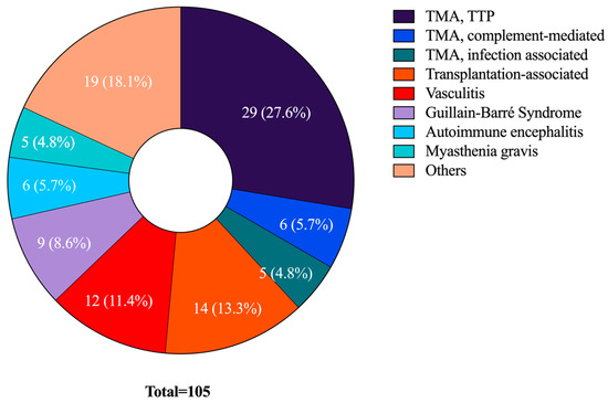 | TMA, TTP (29) | 24 (82.8) | 5 (17.2) | 0 | 0 | 5 (17.2) | 1 (3.5) | 2 (6.9) | 4 (6) | 13 (22) | 26 (89.7) | 7.5 (3) | 7.5 (3) |