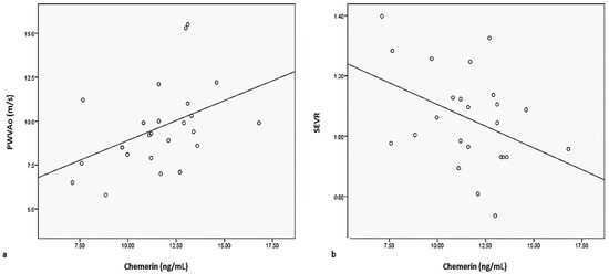 Correlations between serum chemerin levels and (a) PWVAo or (b) SEVR in patients with morbid obesity (PWVAo: aortic pulse wave velocity; SEVR: subendocardial viability index).