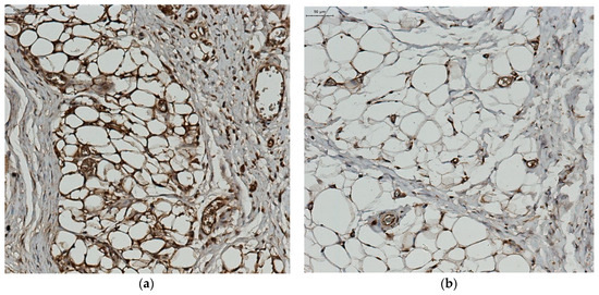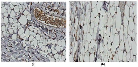AdipoR1 immunoexpression (a) control group. AdipoR1—intense immunoexpression; (b) obese patient—AdipoR1 reduced immunoexpression.
