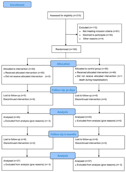 One hundred patients were enrolled. During hospitalization, 50% (n = 50) of them were randomized to the IG and 50% (n = 50) to the CG. A total of 25 individuals were lost to follow-up (13 in IG and 11 in CG), and one patient died during the hospitalization, which translated into a 25% attrition rate. One patient did not receive the allocated intervention due to his death during the initial hospitalization, which happened after the consent signing and randomization. This patient was not included in the final results. Patient characteristics can be found in Table 1. The majority of the studied population were male (65%), and the median age of the study group was 61 years. There were some differences between the groups. The individuals assigned to the IG were younger (56.8 ± 9.23 years old vs. 63.42 ± 11.4 in the control group, p = 0.0019). Atrial fibrillation and heart failure were more prevalent in the CG.