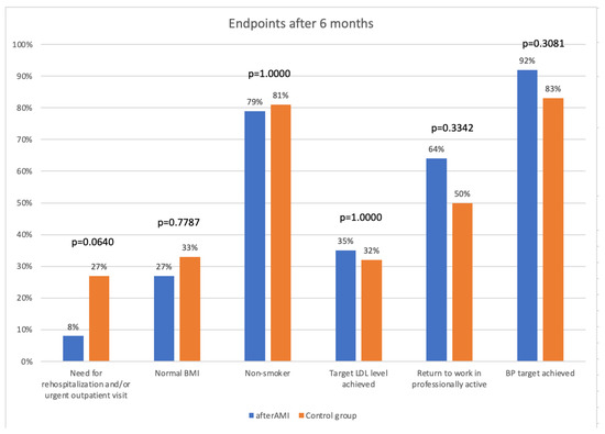No difference in the rate of the primary endpoint of need for rehospitalization and/or urgent outpatient visit was observed (three [8%] in IG vs. 10 [27%] in CG, p = 0.0640). There were no statistically significant differences regarding nicotinism, BMI, meeting LDL target level, meeting target BP, as well as the rate of patients returning to work after AMI. A summary of the results is presented in Figure 3. There was a significant difference regarding knowledge about CVD risk factor observed in favor of the IG (11 points in the test (10–12) vs. nine (8–11) in CG, p = 0.0009).