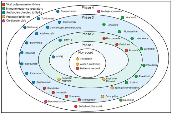 For this review, a literature search was performed in the PubMed and clinicaltrials.gov databases, considering publications from the beginning of the pandemic until 6 July 2022, using topics and subtopics related to use of viral polymerase inhibitors in COVID-19, convalescent plasma therapy in COVID-19, monoclonal antibodies in COVID-19, immune response regulators in COVID-19, and anti-inflammatory drugs for COVID-19. The reviewed publications included clinical trials in patients with severe COVID-19 and reported relevant results regarding mortality rate, hospital stay, ICU requirement, or laboratory parameters. The results were complemented with searches related to the specific background and mechanism of action for each selected drug.