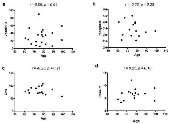 To exclude the effect of age as a confounding factor for vitamins and minerals involved in bone metabolism, we correlated age with such micronutrients and found no correlation with vitamin D (r = 0.08, p = 0.64), calcium (r = 0.25, p = 0.18), phosphate (r = −0.22, p = 0.23) and zinc (r = −0.23, p = 0.21).