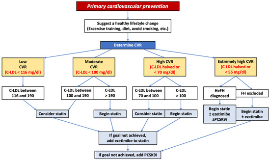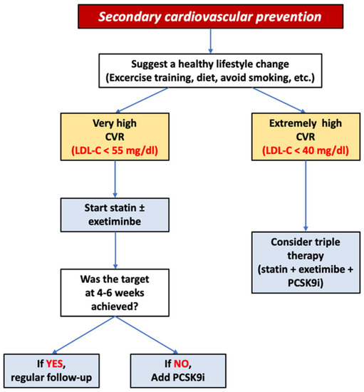 In high-risk CV patients who do not reach their LDL-C goal with high-intensity statin and ezetimibe, the use of PCSK9-i is recommended in secondary prevention (I, A), while it could be useful in primary prevention (IIb, C) [66].