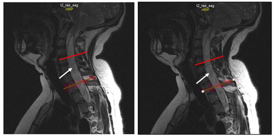 In addition to changes in the structure of the spinal cord, coronal sections revealed signs of moderate curve ‘S’-shaped scoliosis. In the thoracic region, the scoliotic curve bends to the left by 27 degrees, and in the cervical region, the scoliotic curve bends to the right by 20 degrees (Figure 7), which is a characteristic feature for Syr. As we know, the development of scoliosis in such patients may be associated with denervation of the paraspinal muscles [33,34].